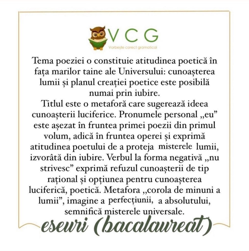 EU NU STRIVESC COROLA DE MINUNI A LUMII – LUCIAN BLAGA (TEMA ȘI VIZIUNEA DESPRE LUME)